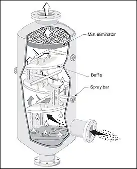 Baffle spray scrubbers are a technology for air pollution control. They are very similar to spray towers in design and operation. However, in addition to using the energy provided by the spray nozzles, baffles are added to allow the gas stream to atomize some liquid as it passes over them.