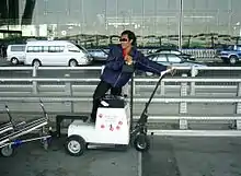 A baggage tug is a small tractor, sometimes an electric vehicle, used by the airline industry to tow baggage carts to and from the terminal/cargo facility and the aircraft.[4]
