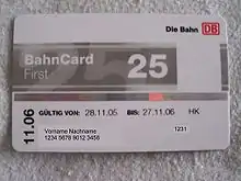 BahnCard (German Bahn – Rail) is a discount subscription programme offered by Deutsche Bahn (DB), the German national railway company. Unlike airline loyalty programs, but similarly to the UK Railcard, the BahnCard entitles the passenger to a discount price and must be purchased prior to travel. The BahnCard is offered in a non-business and a business version called BahnCard Business. Non-business BahnCard contracts are automatically renewed each year, unless they are cancelled with sufficient notice. Three variants of BahnCard are sold by Deutsche Bahn: The BahnCard 25, the BahnCard 50, and the Mobility BahnCard 100. The first two variants allow passengers to get 25% and 50% discount respectively on standard long-distance rail fares, while the Mobility BahnCard 100 is a type of annual ticket that allows free unlimited travel on most of the German railway network for a fixed price.[1] The (non-business) BahnCard 25/50 are valid for one year and can only be purchased by subscription. If they are not canceled no later than six weeks before the expiry date, their term is automatically extended by another year.[1] BahnCard Business 25/50 are also valid for one year but require no cancellation.[2] Unlike the personal BahnCard, BahnCard Business can be combined with the discount that is granted to large-volume business customers.[3][2]