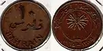 ![]() | 10 fils | 23.5 mm | 4.75 g | Bronze | Palm tree | Value | 1965 |
