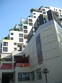 Completed in 1986, Balestier Point, designed by architect Chan Fook Pong and constructed by architectural firm Regional Development Consortium, was one of the first high-rise buildings along Balestier Road.[1][2] The building was originally known as the Central Plaza Complex and was inspired by Habitat 67.[2] The building was built on the former site of the Ruby Theatre.[1] The first two floors of the building are occupied by commercial shop units, followed by two floors of carparks, and thirteen floors of residential units.[3] The building also has a KTV lounge.[4] The building resembles blocks stacked on top of one another, and gained an honourable mention award from the Singapore Institute of Architects in 1986.[5] The building's unique design also made it a local landmark.[3]
