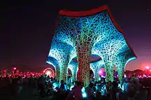 The studio has also completed three installations for the Coachella Valley Music and Arts Festival: Copper Droopscape in 2008, Elastic Plastic Sponge in 2009, and Pulp Pavilion in 2015. In 2015, Architect Magazine bestowed the First Award for its 2015 R+D Awards to the studio for Pulp Pavilion, noting that the “project’s innovative design, ambitious scale, and novel use of a recycled material wowed the jury.” The pavilion was made of recycled paper pulp, a material that the studio had been experimenting with and developing for several years. It comprised seven 20-foot-tall woven tree forms and spanned 1,300 square feet.[11]