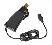 The Astrocade featured a relatively complex input device incorporating several types of control mechanisms: the controller was shaped as a pistol-style grip with trigger switch on the front; a small 4-switch/8-way joystick was placed on top of the grip, and the shaft of the joystick connected to a potentiometer, meaning that the stick could be rotated to double as a paddle controller.