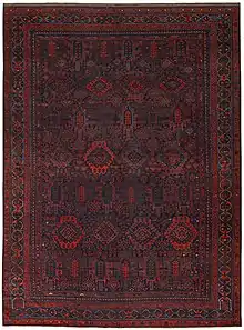 Large Baluch carpet, from the mid 19th century. Alternating rows depict cypress trees and Turkmen Gül motifs in offset coloration. The somber background colors are characteristic of Baluch weavings. This likely was a commission for a tribal Khan or chieftain for ceremonial use.