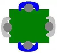 The two members of each team are seated across each other at a table in such a way that no player can see the cards of other players .