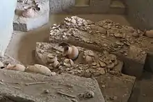 This site has often been called a "cemetery site", but research has suggested that the deceased were buried next to or beneath dwellings. This practice is called residential burial.[6]