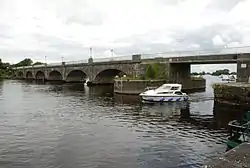 During the Williamite Wars of 1690–1691, the garrison espoused the cause of James II in contrast with that of Birr, which took the side of William. A stone bridge across the Shannon was erected in 1685, and a Williamite army advancing from Birr in 1690 attempted to break it down but abandoned the attempt as too risky in consequence of the presence of Sarsfield's Army on the Connacht side. A broken arch of this bridge is still to be seen on that side a few yards below the present bridge of seven arches, which was erected by the Commissioners for the Improvement of Navigation of the Shannon in 1841–1843. The square tower on the lower side of the bridge at the Galway end was erected to protect the old bridge, as was the Salt Battery, with emplacements for four cannons facing west and north, a few hundred yards from town along the Crank Road.[14]