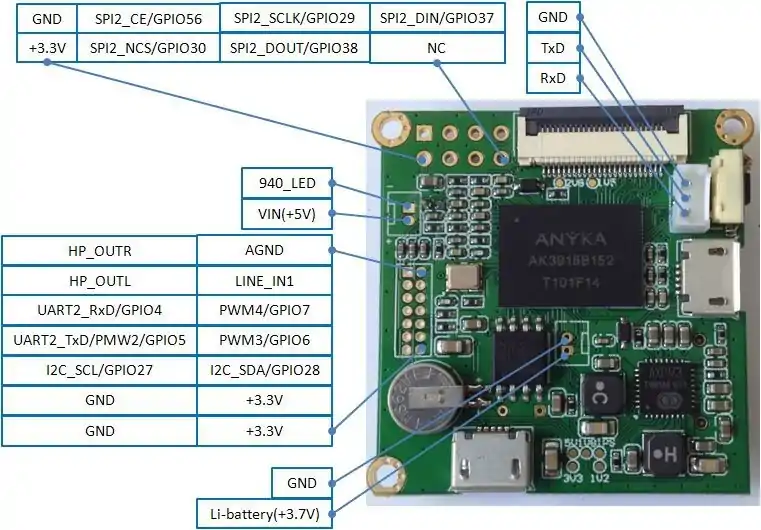 | GPIO | GPIO, UART, I2C BUS, SPI BUS, WITH TWO CHIP SELECTS, ADC, PWM, +3.3V, +5V, GND |
