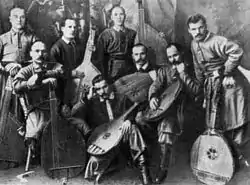 | Prominent early 20th century bandurists in Ukraine | Fedir Zharko, Hnat Khotkevych, Mykhailo Domontovych, Omelchenko Andriy, Serhiy Bashtan, Volodymyr Kabachok, |