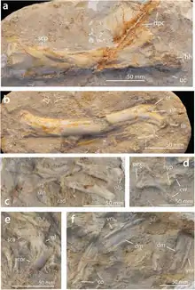 Barbaridactylus is a large nyctosaurid, with a humerus length of 22.5 cm (8.9 in), wingspan of approximately 4 m (13 ft) and a body mass of 4 kg (8.8 lb).[2][4][lower-alpha 1] Like other nyctosaurids, Barbaridactylus had upward-curving jaws. The only known cervical is also rather typical for nyctosaurids, as it is proportionately short and broad, a morphology also present in the related pteranodontids. The scapulocoracoid is fused, meaning that the animal was probably an adult. It is boomerang shaped, and the two bones (the scapula and coracoid) form a 60 degree angle. The humeral shaft is long and thin. The hatchet-shaped deltopectoral crest (a distinctive feature of nyctosaurids) is in a notably distal location in relation to the humeral head, more similar to that of Nyctosaurus than Alcione. This crest is short and broad, and the expanded tip is weakly developed, which are basal features. The deltopectoral crest appears warped from an anterior view, more so than in other nyctosaurids, but much less than in pteranodontids. There is a pneumatic fossa located on the ventral surface of each humeral head that is unique to this species. The ulna is relatively gracile, unlike the robust ulna of Alcione, and its ends are weakly expanded. The diameter radius is approximately two thirds that of the ulna. The femur of Barbaridactylus is relatively typical for a nyctosaurid, although it lacks the strong distal expansion present in other nyctosaurids. Instead, it expands more gently, similar to that of Pteranodon.[2]