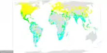 This species breeds across the Northern Hemisphere from sea level to 2,700 m (8,900 ft),[32] but to 3,000 m (9,800 ft) in the Caucasus[2] and North America,[33] and it is absent only from deserts and the cold northernmost parts of the continents. Over much of its range, it avoids towns, and in Europe is replaced in urban areas by the house martin. However, in Honshū, Japan, the barn swallow is a more urban bird, with the red-rumped swallow (Cecropis daurica) replacing it as the rural species.[3]