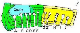 Each of the 11 chambers is reached from the southeast via a long narrow passage (7–12 m long). They are arranged parallel to each other. Shapes and construction techniques differ slightly.