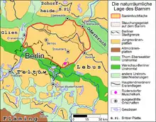 The limits of the plateau are easily definable. The southern boundary is marked by the Berlin Valley, through which the River Spree flows. To the west, the boundary between Barnim and the Glien Plateau is marked by a north-south glacial valley. To the north and north east is the boundary with the Eberswald Valley, and in the east, Lubusz Land.