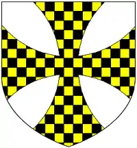 Arms of Lawley: Argent, a cross formée extended to the extremes of the shield chequy or and sable[1]