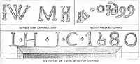 Various inscriptions are carved into the fabric of Barr Castle. These include IW and MH on the pediment above the main entrance, IH and IC 1680 above the lintel at the head of the stair, and WO 1699 on the battlements. The carvings are the initials of various Hamilton Lairds of Barr, John Wallace and his wife Margaret Hamilton, John Hamilton and Jean Cochrane.