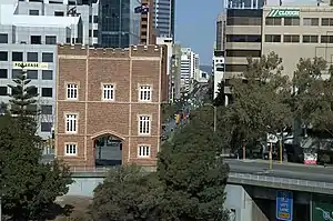 The Government intended to demolish the Barracks to facilitate the building of the Mitchell Freeway after the departments moved to their new location.[3] The Royal Western Australian Historical Society formed a Barracks Defence Council in 1961, and joined the public outcry against demolition in 1966.[3] The Barracks Defence Council worked to keep the arch and five bays of windows either side, and at worst, keep only the gateway and towers.[3] Meanwhile, demolition proceeded, with the third and fourth bays of windows demolished and rubble cleared.[3]