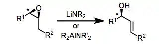In the presence of lithium or aluminum amide bases, epoxides may open to give the corresponding allylic alcohols. Removal of a proton adjacent to the epoxide, elimination, and neutralization of the resulting alkoxide lead to synthetically useful allylic alcohol products. In reactions of chiral, non-racemic epoxides, the configuration of the allylic alcohol product matches that of the epoxide substrate at the carbon whose C–O bond does not break (the starred carbon below). Besides β-elimination some other reactions[2][3] are possible, as metalation of the epoxide ring can take place competitively. Vinylogous eliminations are possible when the epoxide substrate is substituted with vinyl or dienyl groups.[4] Unconstrained systems tend to form trans double bonds, as significant non-bonding interactions are avoided in the transition state for the formation of trans products (see equation (2) below). The strongly basic conditions required for most isomerizations of this type represent the reaction's primary disadvantage.