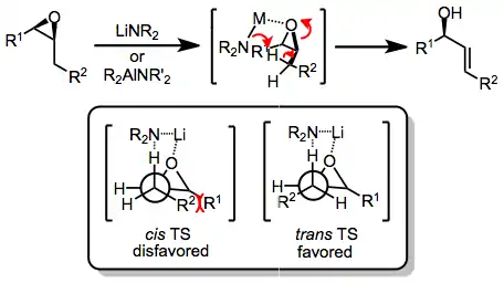 Isomerization of epoxides to allylic alcohols under strongly basic conditions proceeds by a β-elimination process. A model has been advanced that invokes an initial complex between the lithium amide base and epoxide.[5] Concerted C–O bond cleavage and deprotonation proceeds via a syn transition state to give an allylic alkoxide, which is protonated upon workup. Deprotonation typically occurs at the exist in the transition state for cis double bond formation.