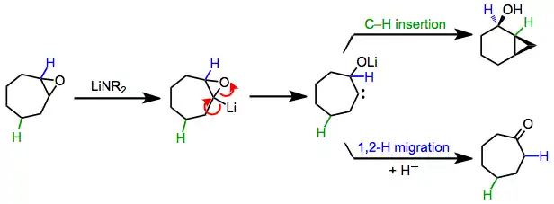Other processes may take place competitively under basic conditions, particularly when β-elimination is slow or not possible.[6] These pathways likely begin with lithiation of a carbon in the epoxide ring, followed by α-elimination to afford a carbene intermediate. 1,2-hydrogen migration leads to ketones,[2] while intramolecular C–H insertion affords cyclic alcohols with the formation of a new carbon-carbon bond.[3](3)