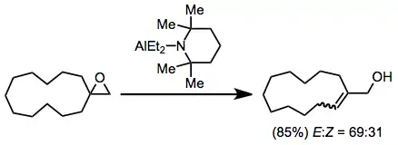 Trisubstituted epoxides do not easily undergo metalation in the ring. As a result, allylic alcohols are formed from these substrates without competitive carbenoid transformations. The use of bulky aluminum amide bases facilitates elimination at the substituent cis to hydrogen, which occurs from the less sterically hindered epoxide-base complex.