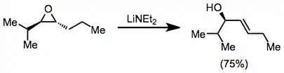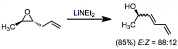 Acyclic disubstituted epoxides undergo deprotonation at the least substituted site (unless a conjugated double bond can be formed; see equation (9) below) with high selectivity for trans double bonds.[10]