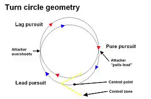 Once inside the defender's bubble, the attacker will be in lead pursuit and may have an opportunity for a lucky "snapshot" hit. If the attacker can maneuver onto the defender's flight path before an overshoot occurs, the attacker will be able to stop or reverse closure rate. The most desirable position is, following the defender's flight path, a distance equal to one turn radius behind the opponent. This position, from which the attacker will be able to safely maintain command of the fight, is termed the "control point". The control point lies in the heart of an imaginary, cone-shaped area, called the "control zone", and it is within this zone that the attacker will have both sufficient time and range to react to the defender's countermeasures.[39]