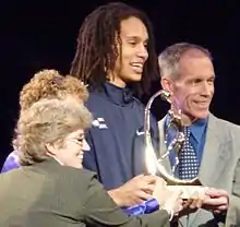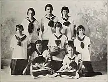 Women's basketball began in 1892 at Smith College when Senda Berenson, a physical education teacher, modified Naismith's rules for women. Shortly after she was hired at Smith, she went to Naismith to learn more about the game.[29] Fascinated by the new sport and the values it could teach, she organized the first women's collegiate basketball game on March 21, 1893, when her Smith freshmen and sophomores played against one another.[30] However, the first women's interinstitutional game was played in 1892 between the University of California and Miss Head's School.[31] Berenson's rules were first published in 1899, and two years later she became the editor of A. G. Spalding's first Women's Basketball Guide.[30] Berenson's freshmen played the sophomore class in the first women's intercollegiate basketball game at Smith College, March 21, 1893.[32] The same year, Mount Holyoke and Sophie Newcomb College (coached by Clara Gregory Baer) women began playing basketball. By 1895, the game had spread to colleges across the country, including Wellesley, Vassar, and Bryn Mawr. The first intercollegiate women's game was on April 4, 1896. Stanford women played Berkeley, 9-on-9, ending in a 2–1 Stanford victory.
