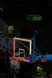 The basket is a steel rim 18 inches (46 cm) diameter with an attached net affixed to a backboard that measures 6 by 3.5 feet (1.8 by 1.1 meters) and one basket is at each end of the court. The white outlined box on the backboard is 18 inches (46 cm) high and 2 feet (61 cm) wide. At almost all levels of competition, the top of the rim is exactly 10 feet (3.05 meters) above the court and 4 feet (1.22 meters) inside the baseline. While variation is possible in the dimensions of the court and backboard, it is considered important for the basket to be of the correct height – a rim that is off by just a few inches can have an adverse effect on shooting. The net must "check the ball momentarily as it passes through the basket" to aid the visual confirmation that the ball went through.[55] The act of checking the ball has the further advantage of slowing down the ball so the rebound doesn't go as far.[56]