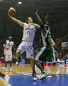 The Euro step (sometimes "Eurostep") is a move developed in European basketball in which a player, after picking up their dribble, takes a step in one direction bumping into their defender, and then quickly takes a second step in the other direction before they attempt a layup. It is an attempt to evade at least one defender before attacking the basket.