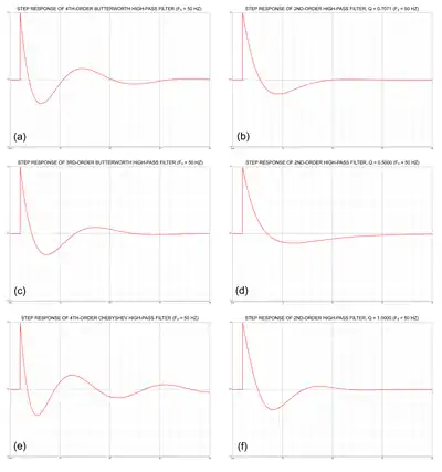 Compared to closed-box loudspeakers, bass reflex cabinets have poorer transient response, resulting in longer decay times associated with the bass notes.[4] Some example step responses for various high-pass filter functions are shown in the relevant figure, where each filter has an identical −3 dB cut-off frequency of 50 Hz. In that figure, (a) represents the step response of a conventional B4 vented box alignment, while (b) represents the step response of a B2 closed-box alignment with Q = 0.7071. The transient response of a vented-box loudspeaker can be improved by choosing a QB3 alignment similar to (c), which results in a more well damped transient response than that produced by the B4 alignment. However, a C4 vented-box alignment similar to (e) results in a less well damped transient response.