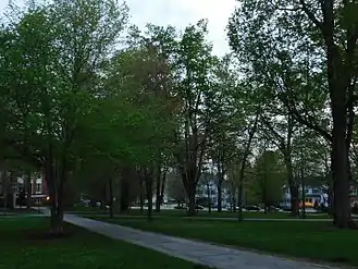 While attending (and later leading) the Freewill Baptist Parsonsfield Seminary, Bates founder, Oren Burbank Cheney worked for racial and gender equality, religious freedom, and temperance.[13] In 1836, Cheney enrolled in Dartmouth College (after briefly attending Brown), due to Dartmouth's significant support of the abolitionist cause against slavery.[13] After graduating, Cheney was ordained a Baptist minister and began to establish himself as an educational and religious scholar.[13] Parsonsfield mysteriously burned down in 1854, allegedly due to arson by opponents of abolition.[14][13] The event caused Cheney to advocate for the building of a new seminary in a more central part of Maine.[13] With Cheney's influence in the state legislature, the Maine State Seminary was chartered in 1855 and implemented a liberal arts and theological curriculum, making the first coeducational college in New England.[15][16] Soon after establishment several donors stepped forward to finance portions of the school, such as Seth Hathorn, who donated the first library and academic building, which was renamed Hathorn Hall.[13] The Cobb Divinity School became affiliated with the college in 1866. Four years later in 1870, Bates sponsored a college preparatory school, called the Nichols Latin School.[13] The college was affected by the financial panic of the later 1850s and required additional funding to remain operational.[13] Cheney's impact in Maine was noted by Boston business magnate Benjamin Bates who developed an interest in the college. Bates gave $100,000 in personal donations and overall contributions valued at $250,000 to the college.[17] The school was renamed Bates College in his honor in 1863 and was chartered to offer a liberal arts curriculum beyond its original theological focus.[18] Two years later the college would graduate the first woman to receive a college degree in New England, Mary Mitchel.[19] The college began instruction with a six-person faculty tasked with the teaching of moral philosophy and the classics. From its inception, Bates College served as an alternative to a more traditional and historically conservative Bowdoin College.[20][21] There is a complex relationship between the two colleges, revolving around socioeconomic class, academic quality, and collegiate athletics.[22][23]
