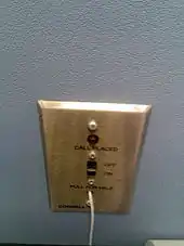 They are often found in the bathrooms of healthcare facilities, such as hospitals, nursing homes, assisted livings, and doctor's offices, in places frequented by senior citizens or disabled people, such as senior centers, places of worship, or in senior housing, and in other places where trouble may arise, such as the lavatories on aircraft or trains and in hotels.[2] These pull cords are part of a communication system where, when pulled, a light outside the bathroom flashes, which notifies a nurse or someone who is around to help the person in need. In addition to the flashing light, a buzzer or tone can be heard. Ideally, they are placed near the toilet or shower.[3]