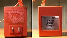 A battery charger, recharger, or simply charger,[1][2] is a device that stores energy in a battery by running an electric current through it. The charging protocol (how much voltage or current for how long, and what to do when charging is complete) depends on the size and type of the battery being charged. Some battery types have high tolerance for overcharging (i.e., continued charging after the battery has been fully charged) and can be recharged by connection to a constant voltage source or a constant current source, depending on battery type. Simple chargers of this type must be manually disconnected at the end of the charge cycle. Other battery types use a timer to cut off when charging should be complete. Other battery types cannot withstand over-charging, becoming damaged (reduced capacity, reduced lifetime), over heating or even exploding. The charger may have temperature or voltage sensing circuits and a microprocessor controller to safely adjust the charging current and voltage, determine the state of charge, and cut off at the end of charge. Chargers may elevate the output voltage proportionally with current to compensate for impedance in the wires.[3]