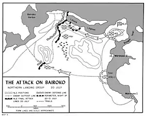 The Battle of Bairoko was fought between American and Imperial Japanese Army and Navy forces on 20 July 1943 on the northern coast of New Georgia Island. Taking place during World War II, it formed part of the New Georgia campaign of the Pacific War. In the battle, two battalions of the US Marine Raiders from the 1st Marine Raider Regiment, supported by two US Army infantry battalions, attacked a Japanese garrison guarding the port of Bairoko on the Dragons Peninsula, advancing from Enogai and Triri. After a day long engagement, the Japanese repulsed the American assault and forced the attacking troops to withdraw with their wounded to Enogai. US forces remained in the area carrying out patrolling and intelligence gathering operations until the end of the campaign. Bairoko was eventually captured at the end of August after the airfield at Munda had been captured, and further reinforcements were sent from there towards Bairoko to clear the area from the south.