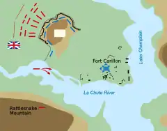 Abercrombie held a war council that evening. The options he presented to his staff were limited to asking if the next day's attack should be in three ranks or four; the council opted for three.[42] Abercrombie's plan of attack omitted Clerk's recommendation to fortify the summit of Rattlesnake Hill; in addition to the frontal assault, 4 six-pound guns and a howitzer were to be floated down the La Chute River and mounted at the base of Rattlesnake Hill, with 20 bateaux of troops to support the effort.[43]