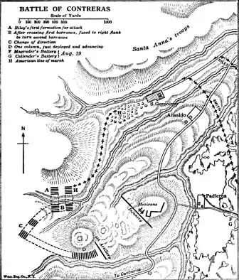 The Battle of Contreras, also known as the Battle of Padierna, took place on 19–20 August 1847, in one of the final encounters of the Mexican–American War, as invading U.S. forces under Winfield Scott approached the Mexican capital. American forces surprised and then routed the Mexican forces of General Gabriel Valencia, who had disobeyed General Antonio López de Santa Anna's orders for his forces' placement. Although the battle was an overwhelming victory for U.S. forces, there are few depictions of it in contemporary popular prints.[4] The armies re-engaged the next day in the Battle of Churubusco.