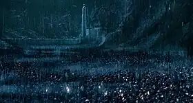 In Peter Jackson's 2002 film The Two Towers the keep was built into the mountainside and resembles a World War I bunker, in keeping with Tolkien's history as a soldier in that war. The entrance to the Glittering Caves of Aglarond is within the Hornburg itself, rather than at the top of the deep behind the Deeping Wall as in the book. Further, the Uruk-hai assault the main gateway in a testudo, or locked-shields style formation, and the 'blasting fire' is depicted as gunpowder.[6][7] The battle was filmed mainly at night, in frequent heavy natural rain or when necessary with artificial rain on the actors, for more than three months.[8] The Helm's Deep set used some computer-generated imagery; some parts were constructed as full size sets; some shots used a 1/4 scale physical model, while more distant shots used a 1/85 scale model. In the final battle scene, Weta's "Massive" crowd simulation software and "Grunt" rendering software were used, with thousands of Uruk-hai modelled using Alias/Wavefront's "Maya" software.[9] It has been described as one of the greatest battle scenes in film, combining "technical mastery, sweeping spectacle and tonal balance".[8][10] In the film, 10,000 of Saruman's Uruk-hai (with no Orcs of other races, Dunlendings or wargs to accompany them) lay siege to the fortress, defended by around 300 Rohirrim. Soon after, however, a large group of the Elves of Lothlórien join the defences, sent by Elrond, at Galadriel's prompting. The defenders suffer heavy losses, but hold out until dawn, when Gandalf arrives with 2,000 riders led by Éomer, who turn the tide of the battle and rout Saruman's forces.[11] In the original script of the film, Elrond and Arwen had gone to see Galadriel in person, and it was Arwen who led the Elves to fight alongside the Rohan defenders. Jackson rejected Arwen's involvement, revising her character from a "warrior princess" to a role closer to that of the book, but kept the Elves in the battle.[12]