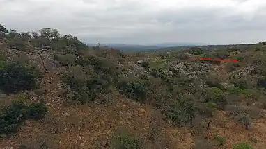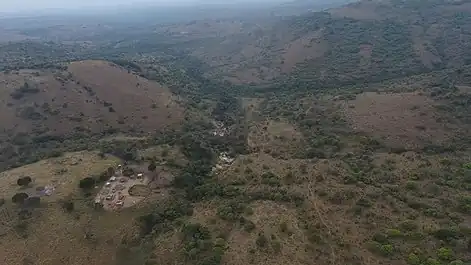 Ndlela ka Sompisi lured the Voortrekkers close to uMgungundlovu. The Voortrekkers descended from Kataza Mountain in the Ntonjaneni range down a mountain pass. The royal capital was visible some 5km away, and across the Nzololo stream in the valley they could see some Zulu warriors atop a small hillock, sitting quietly on their shields. This small hill was close to the centre of a basin formed by low ridges and was called Italeni.[7] It stood like a sentinel some 3000m from uMgungundlovu. There was a plain between Italeni and the Nzololo stream on the western side of the basin. The Reed creek ran diagonally across the basin from east to west below a low neck between Italeni and the eastern rim of the basin. Deep gulleys and dongas criss-crossed the rocky terrain.[6]