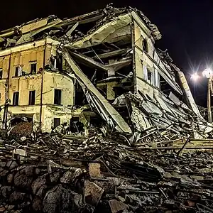 Lebedyn was completely cut off from electricity for the 4 and 5 of March. On 5 March at 7 a.m., civilians heard an air raid alarm in Lebedyn as the Russians began shelling the city.[13] The explosions blew out windows in multistoried buildings. The artillery shelling went on all day long.[7] An electric substation, the Lebedyn bakery, and a gas station were destroyed by Russian shelling.[14]