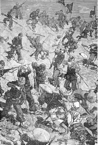 When the attacking wave was twenty metres from the dyke the bugles sounded the charge, and the two marine infantry companies stormed the embankment. Taccoën's company, leading the way, lost 5 men killed and 10 wounded in its approach. Guérin de Fontjoyeux's men suffered almost as heavily, and two lieutenants were also killed during the assault. But the attack was so rapid that around fifty Black Flags, who had been lying on their backs asleep, did not have time to get to their feet, and were pinned to the ground with bayonet thrusts. The surviving Chinese fled across the rice paddies. The French killed many of them with rifle fire as they fled.[4]