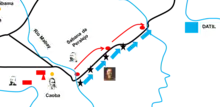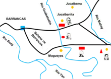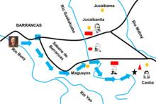 Both Spanish generals with a column of 1,540 men, depart from Barrancas along the Solís road which was thelower route, and separating at Magueyes, Campos reinforced with Captain Travesí's Guerrilla by the Peralejo road and Santocildes penetrating the mountain in a parallel direction from Martínez Campos, outwitting the ambushes of Rabí's infantry and attacking Alfonso Goulet's impedimenta.