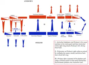 According to Polybius, Ptolemy had 70,000 infantry, 5,000 cavalry, and 73 war elephants and Antiochus 62,000 infantry, 6,000 cavalry, and 102 elephants.[3]
