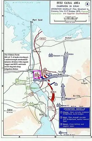 At 2:00 am, General Shmuel Gonen called Adan and asked him if he could capture Suez in the two to two and half hours between dawn and the ceasefire. Adan answered that it depended on the Egyptian defenses in the town, but that he thought that at least part of the town could be taken. Gonen said: "Okay, if it's Beersheba, go ahead; if it's Stalingrad, don't do it!", referring to Operation Yoav and the Battle of Stalingrad, respectively. Adan gave his orders accordingly.[9] Israel argued that the attack would not be a violation of the ceasefire if it was launched before 7:00 am, even if the battle continued after that hour, since the Arabs were the ones who chose when to start the war and when to call for a ceasefire. Israel also claimed that the ceasefire did not apply to "mopping up" operations that were altering the rear areas and not the front line. Intelligence knew of a commando battalion, two infantry battalions and an antitank missile company. Since Egyptian soldiers had been mostly surrendering during the previous two days, Adan assumed the defenders of Suez would not resist.[14]