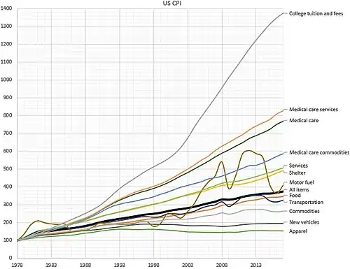 The Baumol effect has been applied to the education sector,[35][36][37] including by Baumol himself.[38][39] By most measures, productivity growth in the education sector over the last several decades has been low or even negative;[40][41] the average student-teacher ratio in American universities, for instance, was sixteen to one in 2011, just as it was in 1981.[37] Yet, over this period, tuition costs have risen substantially.[42] It has been proposed that this is at least partially explained by the Baumol effect: even though there has been little or even negative productivity growth in the education sector, because of productivity increases across other sectors of the economy universities today would not be able to attract professors with 1980s-level salaries, so they are forced to raise wages to maintain their workforce. To afford the increased labor costs, universities raise tuition (i.e. they increase prices).[43]