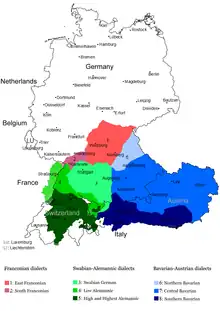 Bavarian (German: Bairisch [ˈbaɪʁɪʃ] (listen), Bavarian: Boarisch) or alternately Austro-Bavarian, is a West Germanic language[2] consisting of a group of dialects, part of the Upper German family, together with Alemannic and East Franconian.