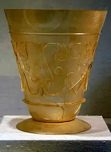In archaeology, a beaker is a small round ceramic or metal drinking vessel shaped to be held in the hands. It has no handle or spout.