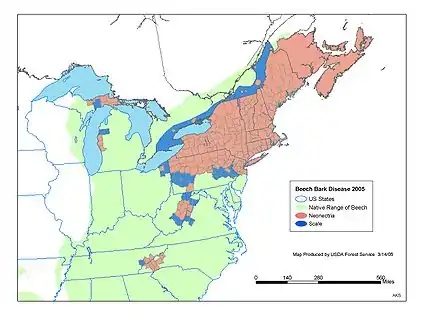 In Europe, beech bark disease was first documented in 1849, while the first North American observation of Cryptococcus fagisuga occurred in 1890 and the first North American observation of Neonectria dates to approximately 1900.[4] At first, it was believed that the scale insect was the main cause of the disease. It was not until 1914 that the Neonectria fungus was associated with the disease.[1][2] The first outbreak of beech bark disease in North America appeared in American Beech (Fagus grandifolia) in Nova Scotia around 1920. The disease then started to spread to the south and west. The first case of beech bark disease in the United States was reported in 1929 in Massachusetts. By 2004, the disease had spread as far west as Michigan and as far south as western North Carolina.[2][3]