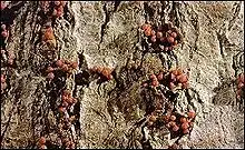 There are two fungi common to North America that are important to the beech bark disease process. They are Neonectria faginata and Neonectria ditissima. The primary fungus is N. faginata, though N. ditissima is very important in some areas.[1] These fungi infect the tree through the wounds caused by the beech scale insect and then begin to produce spores. Spores are contained in perithecia, which are red, lemon-shaped fruiting bodies that form in clusters on the bark. These perithecia mature in the fall, and once they have become sufficiently moist, they each release eight spores that are carried by the wind to other beech trees.[1][3] Even though the perithecia occur on dead bark, they still have the ability to produce viable spores the next year.[1]