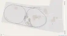 The nearly 1 mile (1.6 km) railway track with a gauge of 2 ft (610 mm) was built between 2002 and 2004.[6] It resembles a figure of eight, with a loop around the back garden and another around the front, where it crosses the main drive. An Indian style railway station and sheds are behind the house. The theme of an Indian railway is present throughout, including the name of the station ("Ringkingpong Road Station"), fare evasion signs citing Indian rupees, and some interior decorations as well. Although the railway is private, and not subject to rail regulations, it is run professionally by Shooter and some volunteers with railway rulebooks and regulations, and the steam engine has to be certified each year.[7]