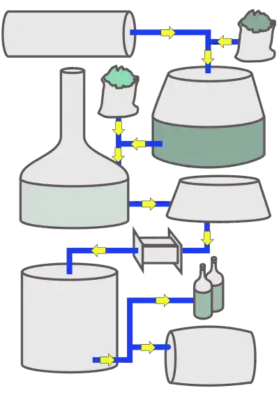 The first step, where the wort is prepared by mixing the starch source (normally malted barley) with hot water, is known as "mashing". Hot water (known as "liquor" in brewing terms) is mixed with crushed malt or malts (known as "grist") in a mash tun.[51] The mashing process takes around 1 to 2 hours,[52] during which the starches are converted to sugars, and then the sweet wort is drained off the grains. The grains are then washed in a process known as "sparging". This washing allows the brewer to gather as much of the fermentable liquid from the grains as possible. The process of filtering the spent grain from the wort and sparge water is called wort separation. The traditional process for wort separation is lautering, in which the grain bed itself serves as the filter medium. Some modern breweries prefer the use of filter frames which allow a more finely ground grist.[53]